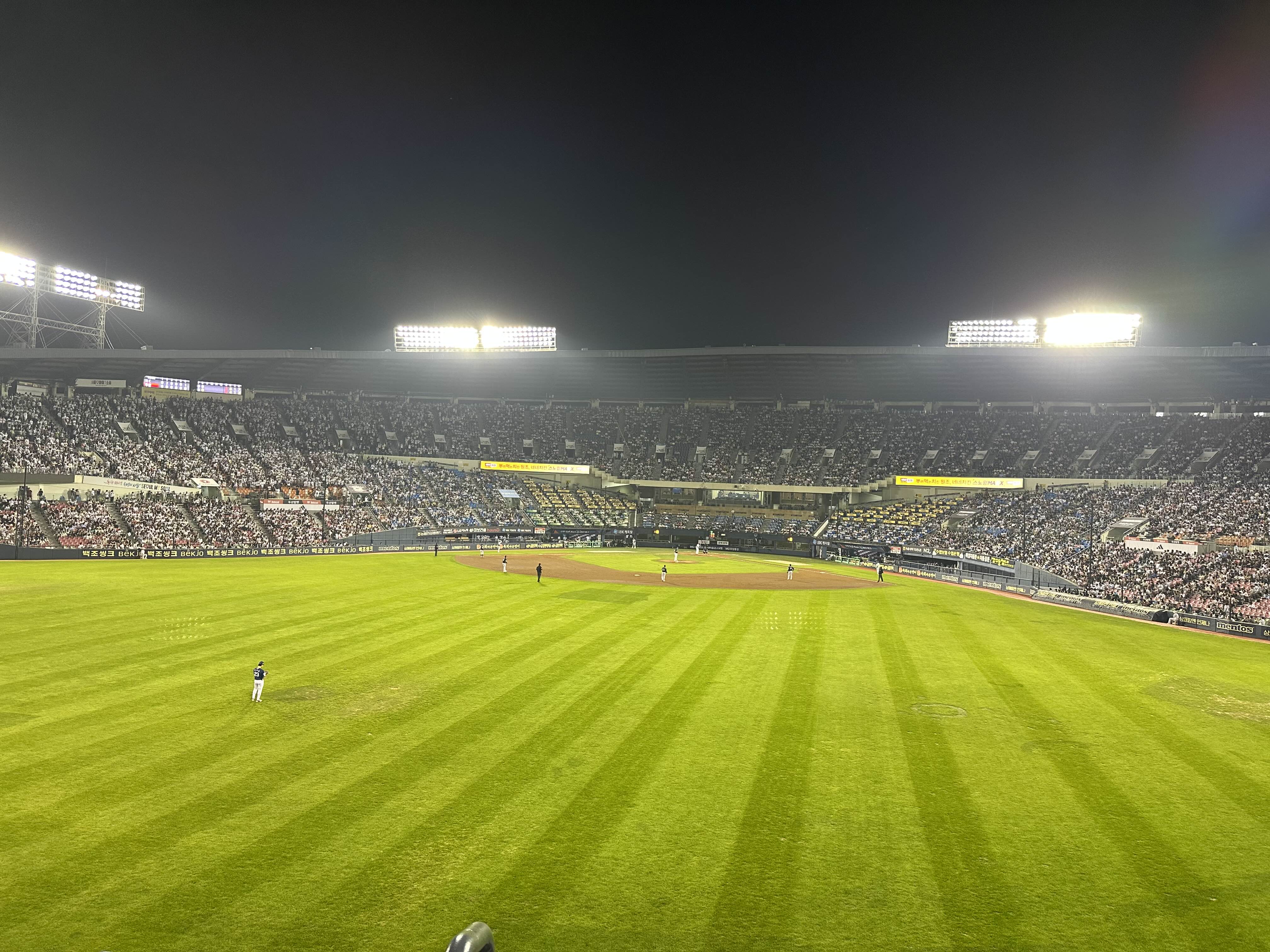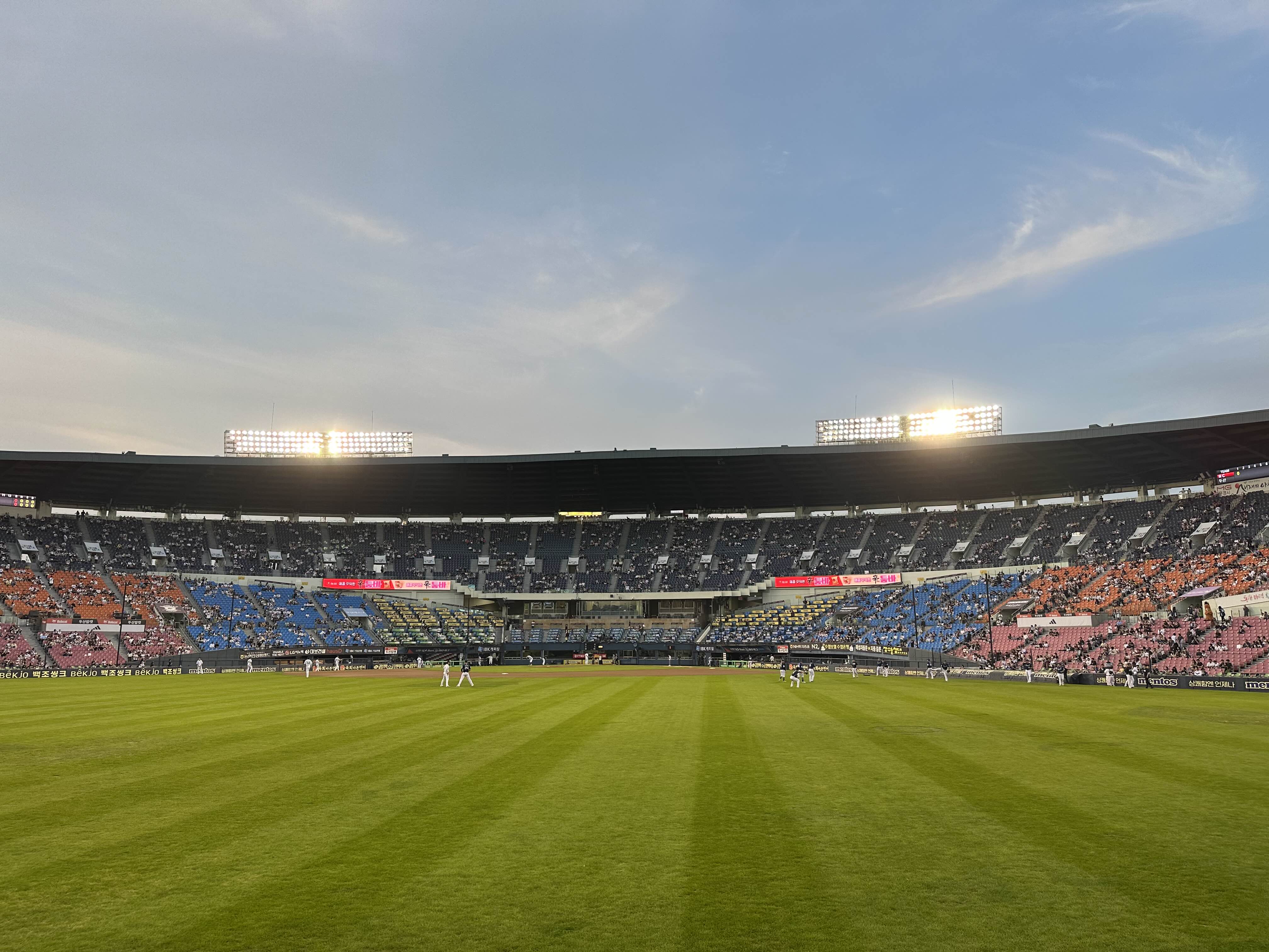 사람이 많아서 아이들 잃어버릴까봐 신경이 곤두선 상태로 티켓을 수령하고(온라인으로 예매했는데 왜 종이티켓을 수령받아야 하는지 아직도 노 이해…), 겨우겨우 자리에 앉았다. 여기서 추가된 난관. 외야 제일 앞자리를 예약한다고 했는데, 잘못 생각하고 제일 꼭대기 자리를 예배해버린것이다. 다행히 3루 외야는 관람객이 적어서 제일 앞 줄 빈 자리에 앉을 수는 있었다.